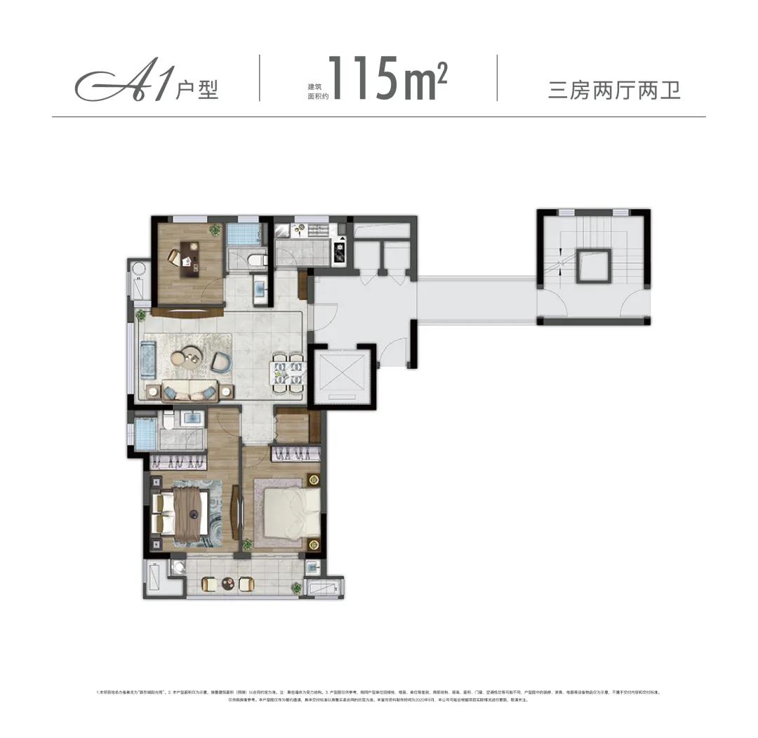 而115㎡同樣作為明星戶型,則更注重陽光、景致與居住私密性。三面采光+餐客廳一體+套房式主臥+雙聯(lián)陽臺,將品質與靜謐的生活周到考量,在一方美好空間里,可觀、可賞、可憩。